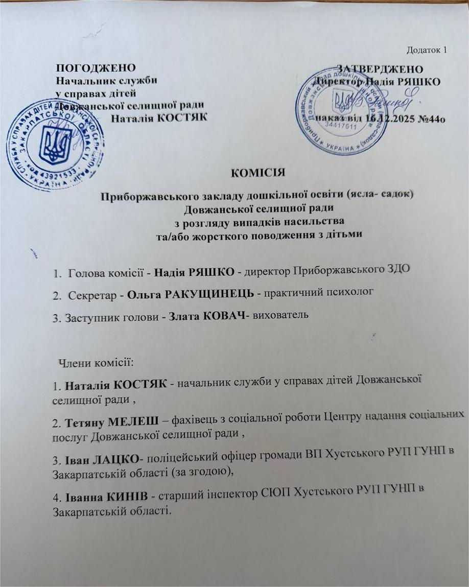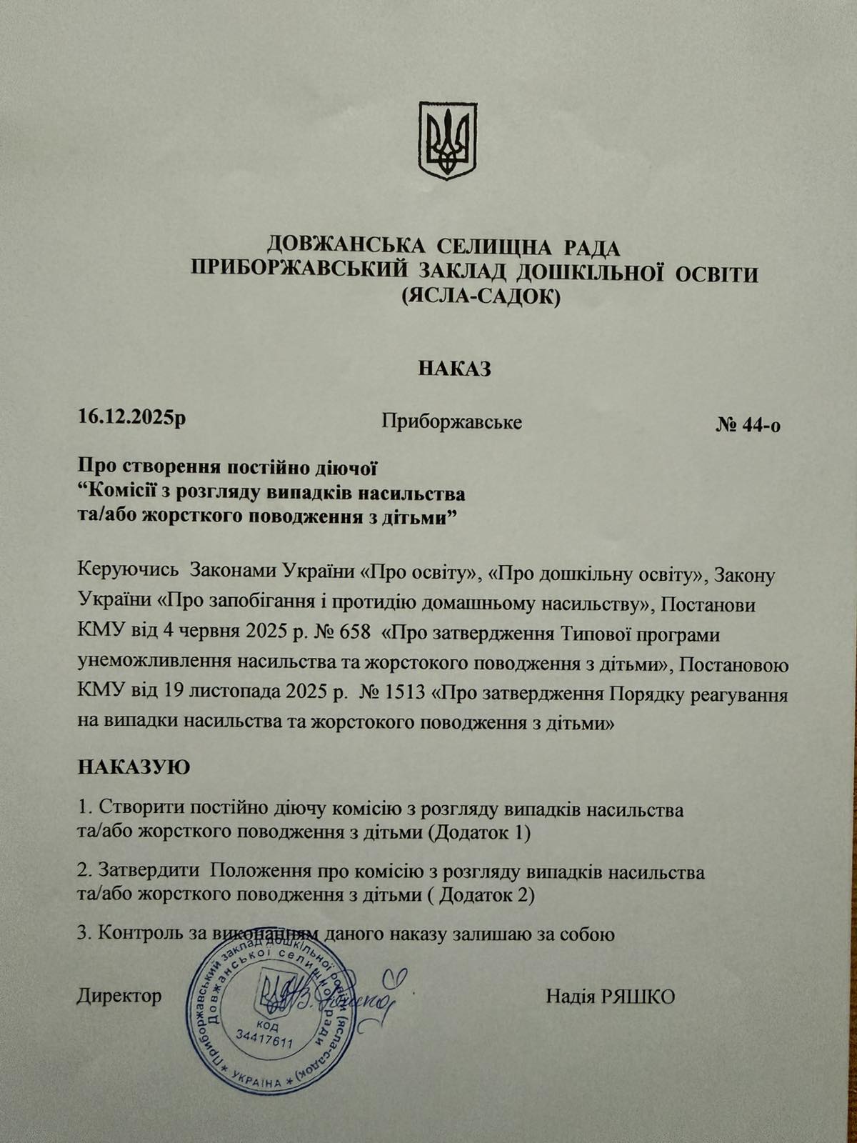 На виконання Постанови КМУ від 19.11.2025р. №1513 Про затвердження Порядку реагування на випадки насильства та/або жорсткого поводження з дітьми у закладі створена комісія.